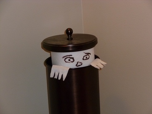 We have one of those round toilet paper holders in the powder room. I carried 3 rolls down to refill the holder, but there was already one in it. Rather than carry the extra back up, I just put it on top. The result was too much to pass up. A little work with a Sharpie and some scissors created a little TP monster. My wife thinks it is super creepy. I think it's hilarious.