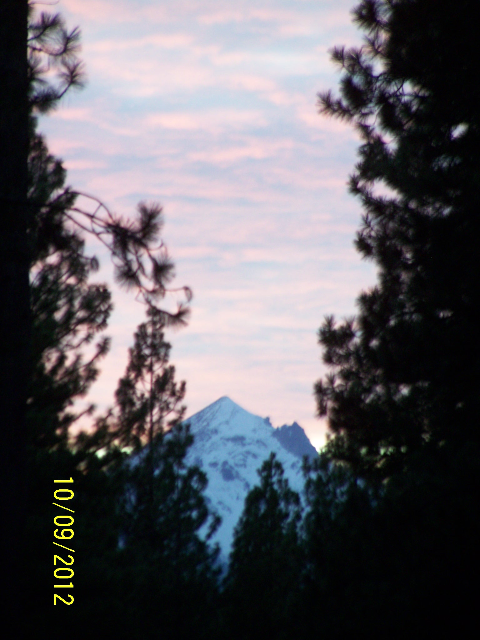 The pic I didn't get - which would have been great - is by the time I got around the west side (that'd be the right side in this pic for the GPS/non-compass generation ) the sunset had pink and purple hues on just the upper fourth of the snow. As you drive on the SW side there's a big cinder cone called Black Butte that briefly blocks the view.