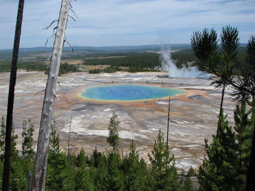 This picture was taken at the Midway Geyser Basin in Yellowstone Park. The Grand Prismatic Spring is only seen in this view by climbing the hill behind it, no organized trail climb at your own risk !