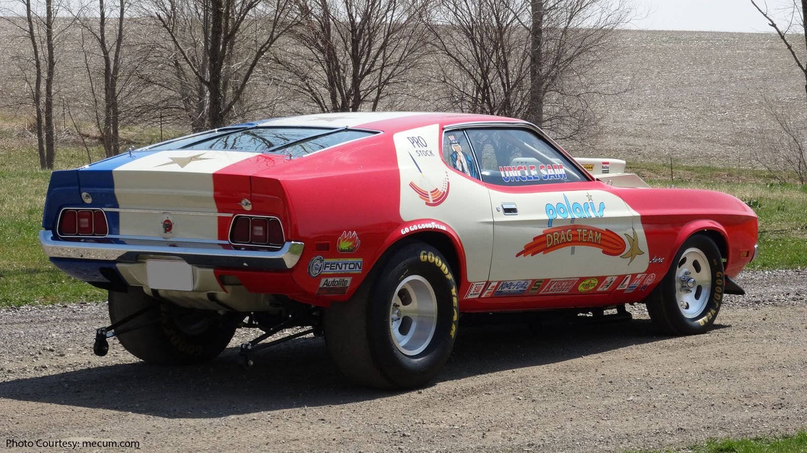 This is a 1971 Ford Mustang Polaris and features a Holman Moody Boss 429 V-8 engine. The drag racing monster is painted to represent its roots: American-muscle. This Mustang was the original Polaris Team American Way vehicle, so you can only imagine what it has been through.