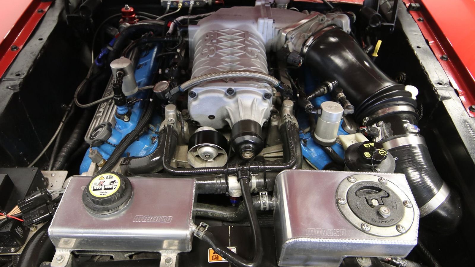 And that brings us to the power unit. Pop the hood and you will find the 5.8-liter supercharged V8, shades of the 2014 Shelby GT500. The restomod's Ford Racing long block V8 has been enhanced for even more output, with custom internals. All the power is transmitted to the wheels via a Tranzilla manual 6-speed, 5-inch aluminum driveshaft, and an Auburn locker 36-spline rear end.