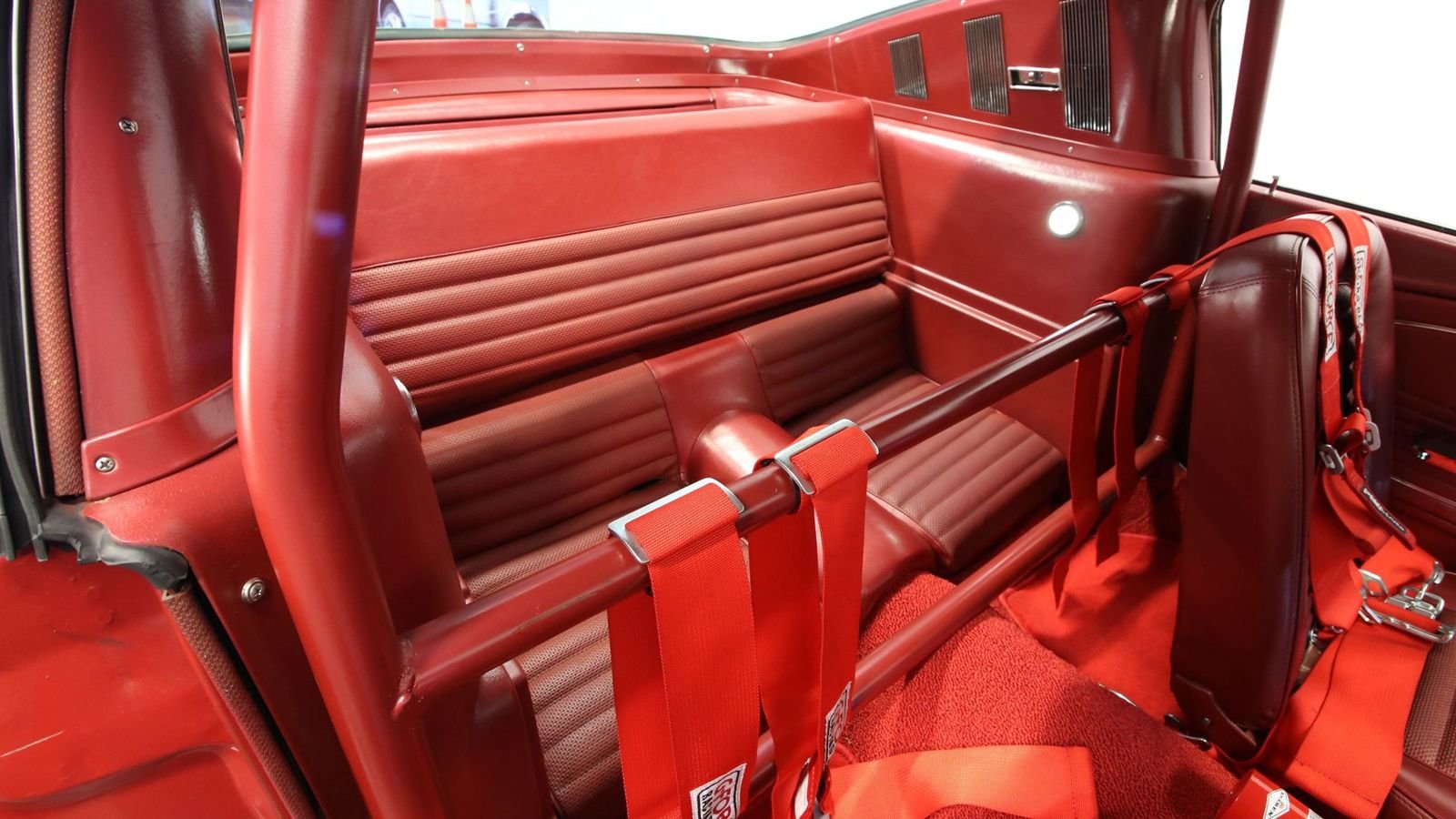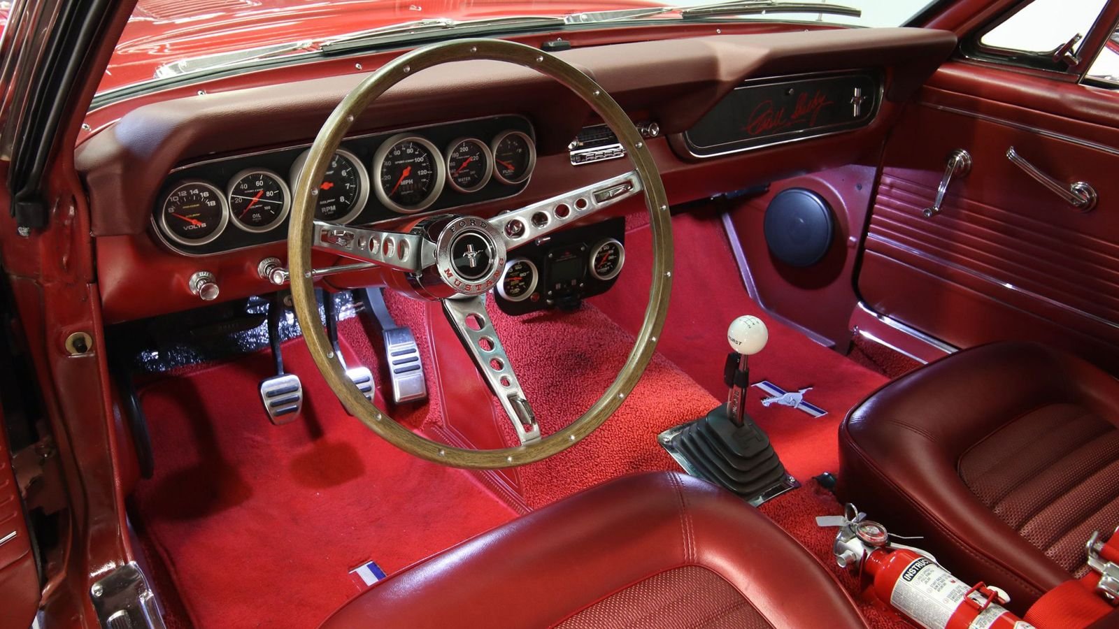 The fire extinguisher in between the front seats, the racing harness, and that big ol' roll cage aren't elements normally found inside a Mustang. With that said, the theme of keeping the original look continues here. Even the steering wheel is a classic wood-trim three-spoke. There's practically no use other than cargo for those rear seats, though. Getting past the roll cage to climb into the back would be a task and a half!