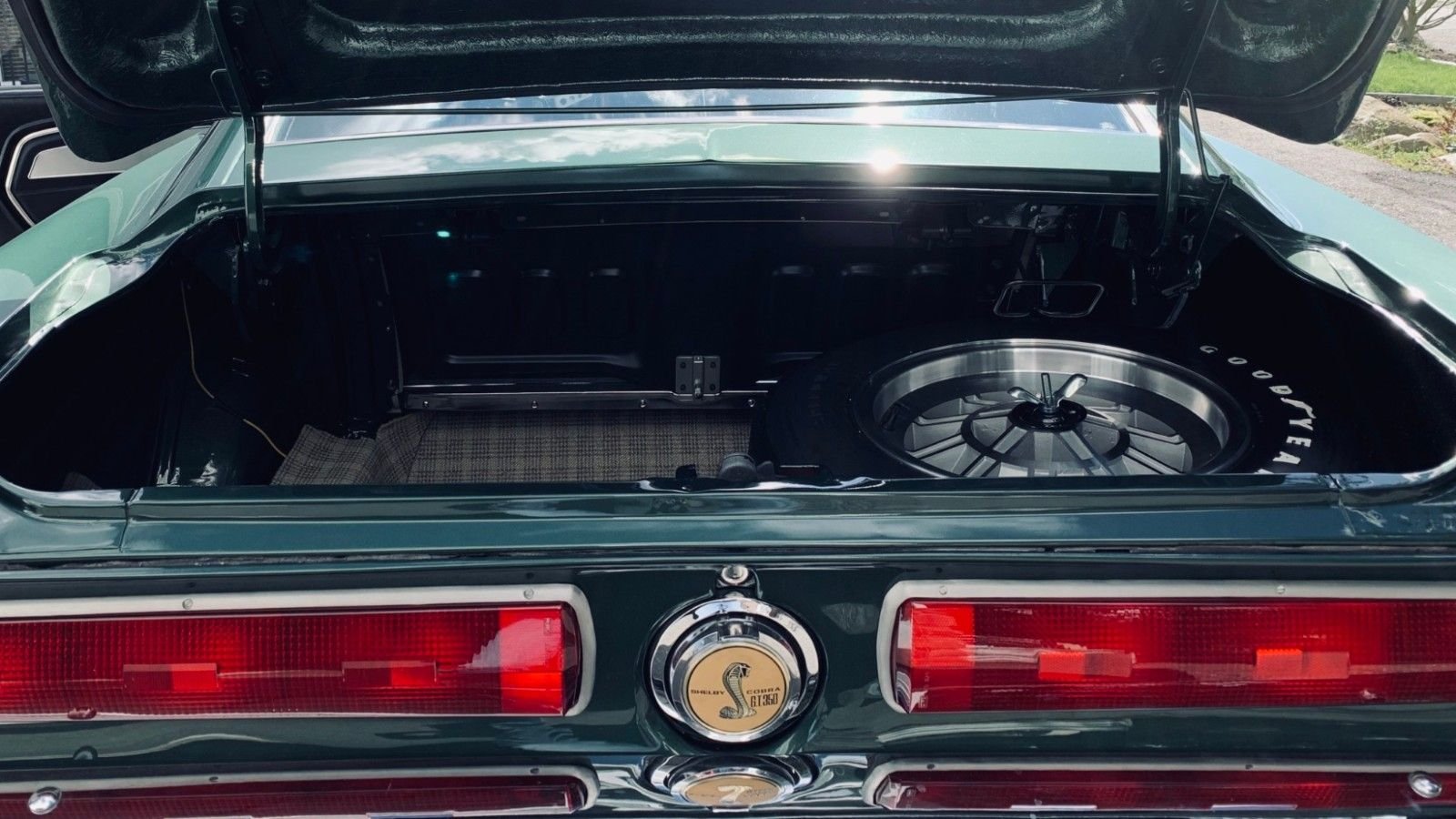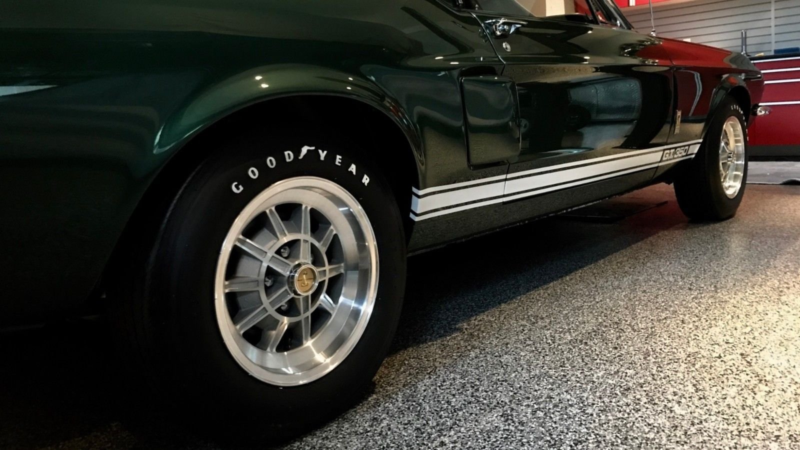 Goodyear Speedway tires wrap classic 15-inch 10-spoke wheels which house Shelby center caps. These wheels are sparkling clean and don't have a mark on them.