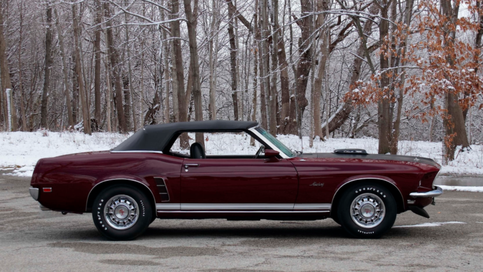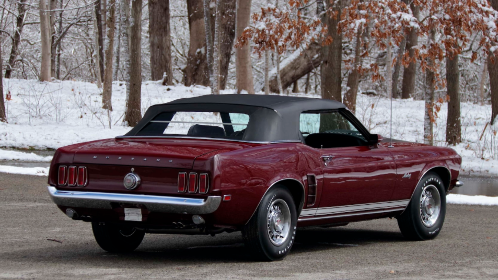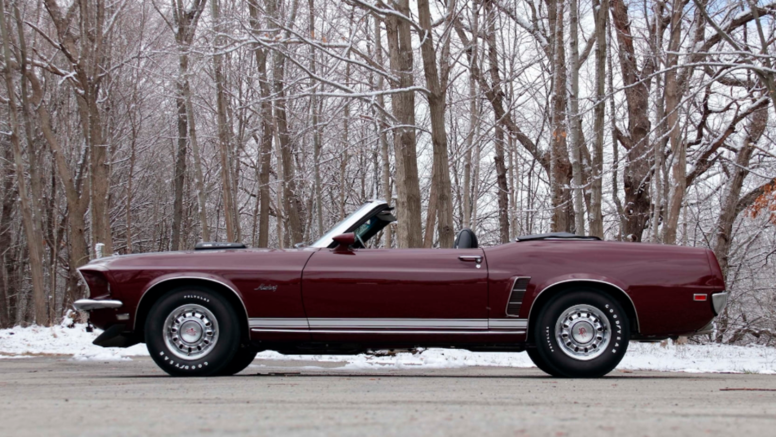 This Mustang GT's steel wheels are wrapped by Goodyear Polyglas tires. This, coupled with the car's C6 Cruise-O-Matic automatic transmission, keeps it riding as smooth as possible.