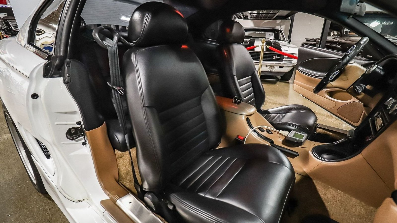 On the inside, this Mustang even has a set of Saleen gauges and door sills, which shows you just how far the seller went to make this car seem like the real thing. Otherwise, its black and tan interior is in solid condition for the year, especially since the car itself has over 100k miles on the clock.