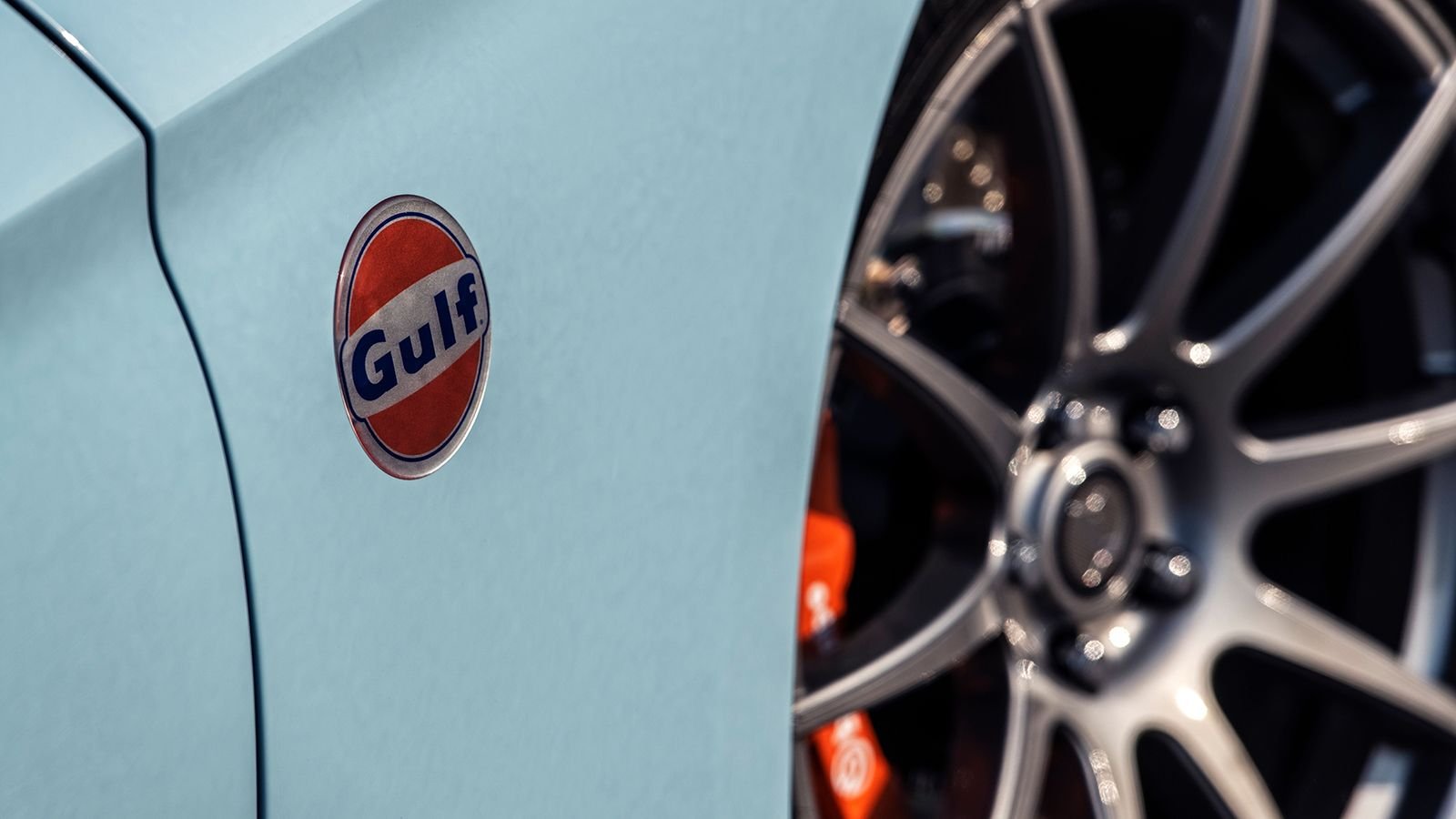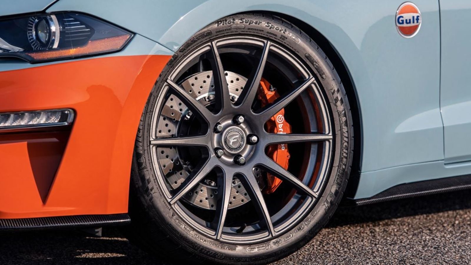 It takes a lot to slow down 808 racing horses. The Gulf Heritage Mustang comes equipped with Gulf Orange Brembo 6-piston calipers with 15.1-inch rotors for the front brakes and Gulf Orange Brembo 4-piston calipers with 15.1-inch rotors for the rear. The Gulf Orange calipers stand out against the car’s beefy 20-inch alloy wheels finished in gloss gunmetal.
