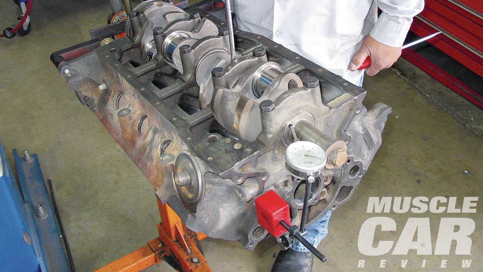 We saved this easy-to-do, but not-so-easy-to-access, check for last. Crank endplay is the fore/aft movement of your crankshaft. It's measured with the crankshaft, main bearings, and thrust bearings installed and main caps fully torqued down, and best done as part of a test assembly prior to the final assembly of your engine. Use a dial indicator to measure the movement of the crank as you carefully pry it, using prybars or large screwdrivers, to its forward and rearward extremes. Pry until it stops moving but don't reef on it, you're not trying to bend anything, just make sure it reaches the endpoints of its travel. The measurement you come up with needs to fall within the safe range given by your manufacturer—there's not a lot of room to mess around with this one.