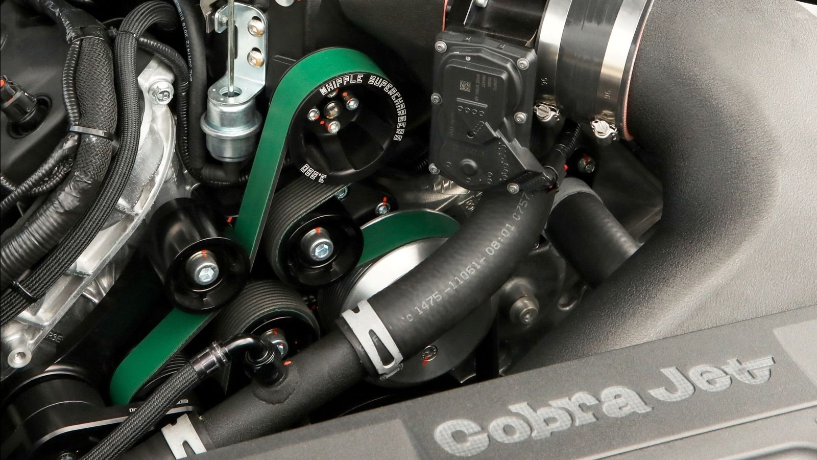 The 50th-anniversary Mustang Cobra Jet is driven by a 5.2-liter Coyote V8 engine that comes fitted with a huge 3.0-liter Whipple supercharger. The actual output horsepower and torque figures for this engine have not been released yet, but Ford insists that the supercharged 5.2-liter Coyote V8 is the most powerful Cobra Jet engine yet.