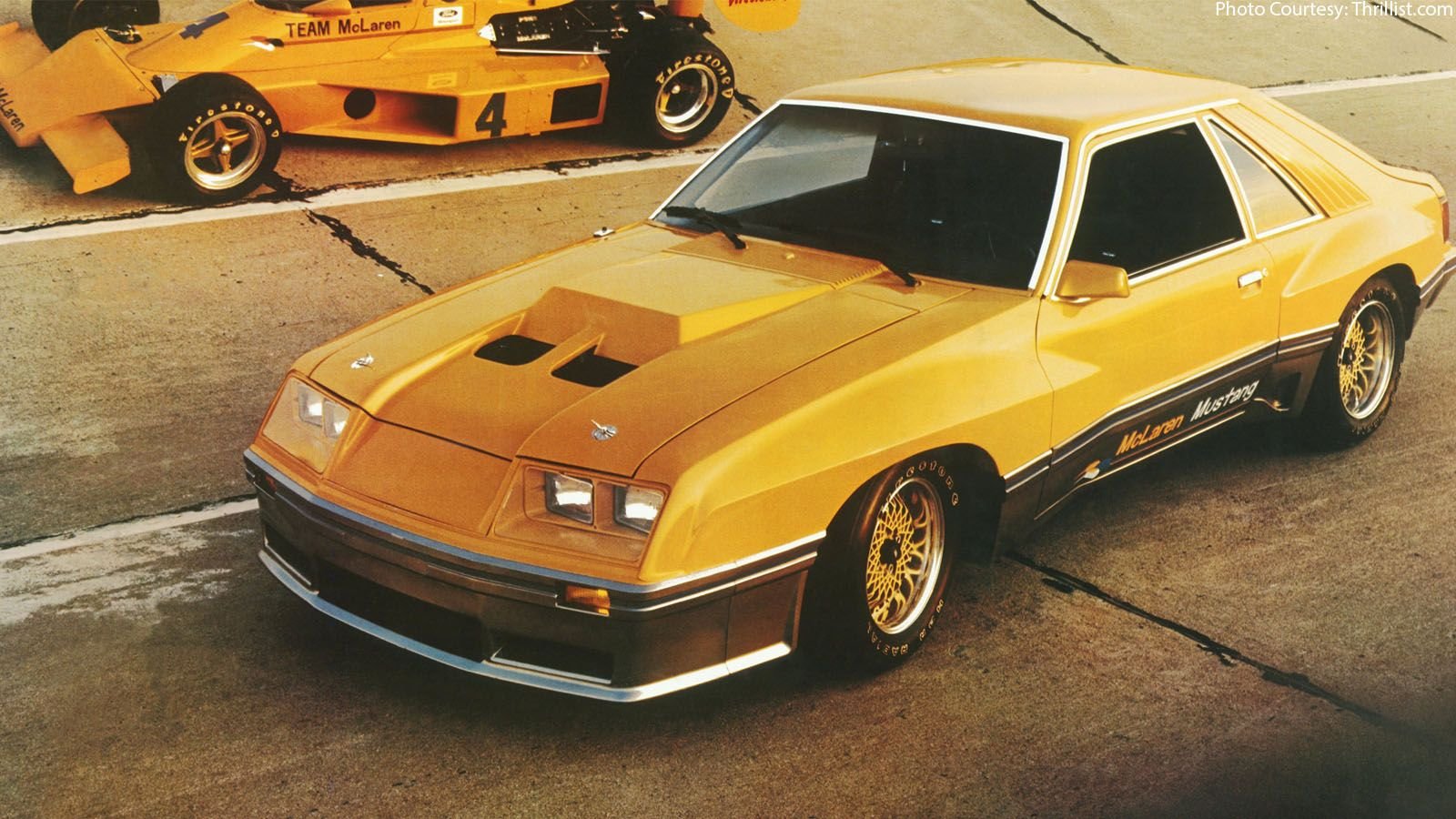 Ford collaborated with McLaren to create 11 Ford Mustang McLarens in 1981 based on the Fox Body. Shortly after, they collaborated with American Sunroof Company to make a line of McLaren Mustang convertibles. This picture was the official advertisement for the unique, Formula One inspired, McLaren Mustang collaboration.