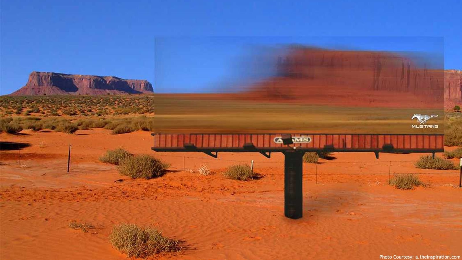 A brilliant custom-made billboard, which shows some of the potentials of the Mustang. The car is too fast, it is hard to capture it on the billboard. For a car like the Mustang, all you need is a creative idea and the Mustang logo, and we are sold. The question is, how many of these billboards were made, and how much work it took to blend it in with the background?