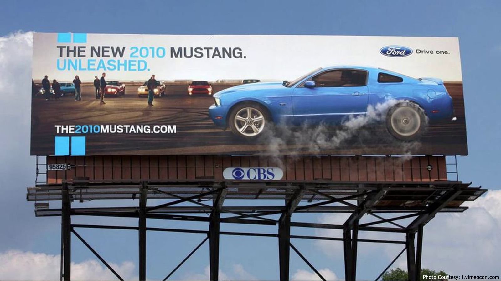 This billboard advertises the 2010 Mustang, and the best way to represent it properly is to capture its aggressiveness. If you're a Mustang fan, you are most likely one because of its power, performance, and mean attitude, and driving by this billboard will make you want to turn into the track and blow off some steam.