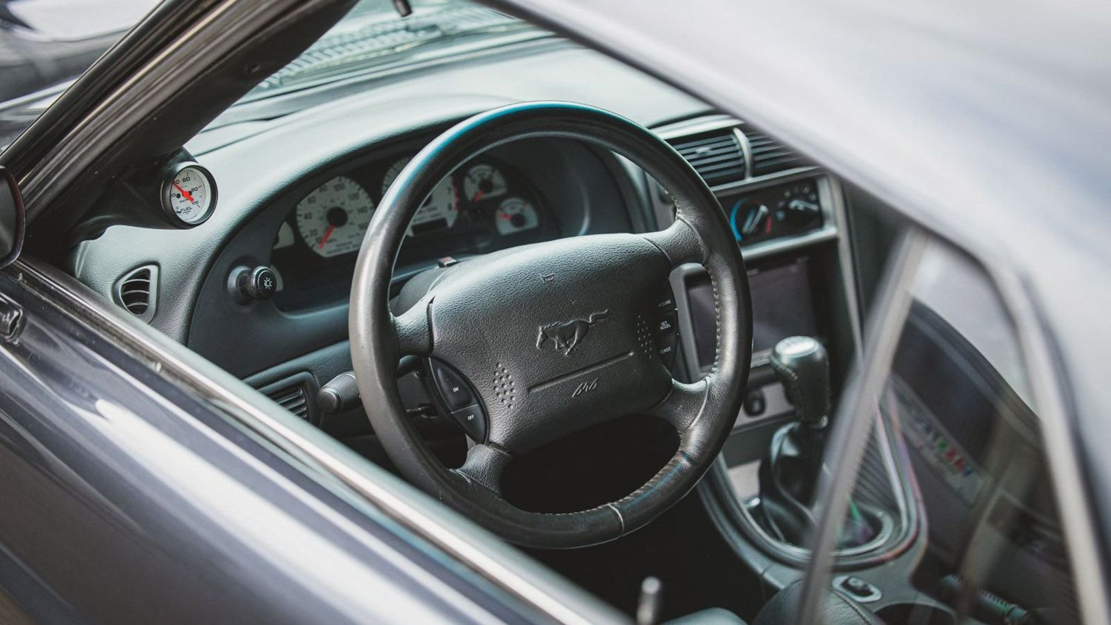 The cabin of the 2003 Mustang SVT Cobra remains largely unchanged from the factory. That is, of course, with the exception of a boost gauge, which is a bi-product of adding in the supercharger.