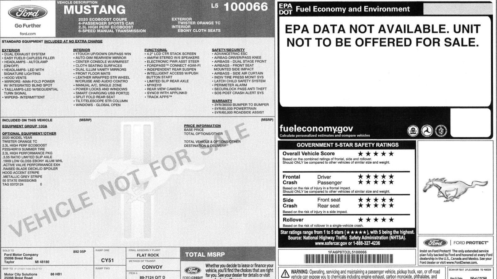 This Mustang was the first off the assembly line so it does not have a price sheet as it is intended for staff and VIP drivers. However, the base four-cylinder EcoBoost starts at $26,670. We ordered this car with the 2.3L package and no other options, known as a "stripper" in the industry. That means no leather trim, stereo, sunroof, or other fluff, just the performance package which adds about $5K extra. Thus the total tab with shipping comes to $33,335. That is far cheaper than the GT V-8, and at a price, anyone can afford it.
