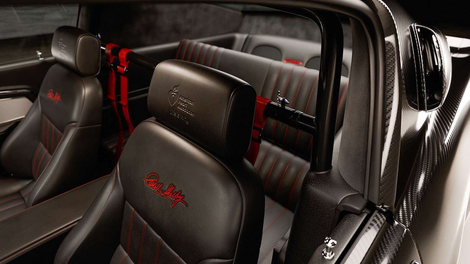 Inside the Centennial GT500CR, luxury meets functionality with Caroll Shelby Scat Rally Series seats, Shelby signature gauges, and premium materials like black leather and Alcantara trim. Emblazoned with the American Heart Association's logo, the cabin exudes exclusivity and attention to detail.