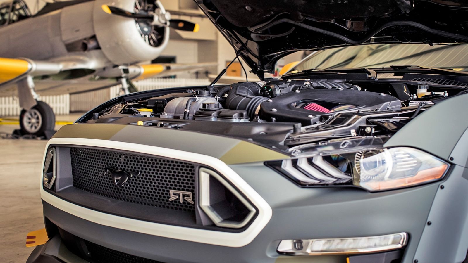 The interior of the car showcases Recaro racing buckets branded with the Eagle Squadron logo. The shift knob has been hand engraved and comes from a melted down F-35 Lightning and the badge on the dash comes right from the aluminum off a Spitfire. On the outside, the car wears an RTR carbon widebody kit with a spoiler, integrated lights, and various aero parts. The wheels are RTR Aero 7 two-piece 20-inch forged wheels.