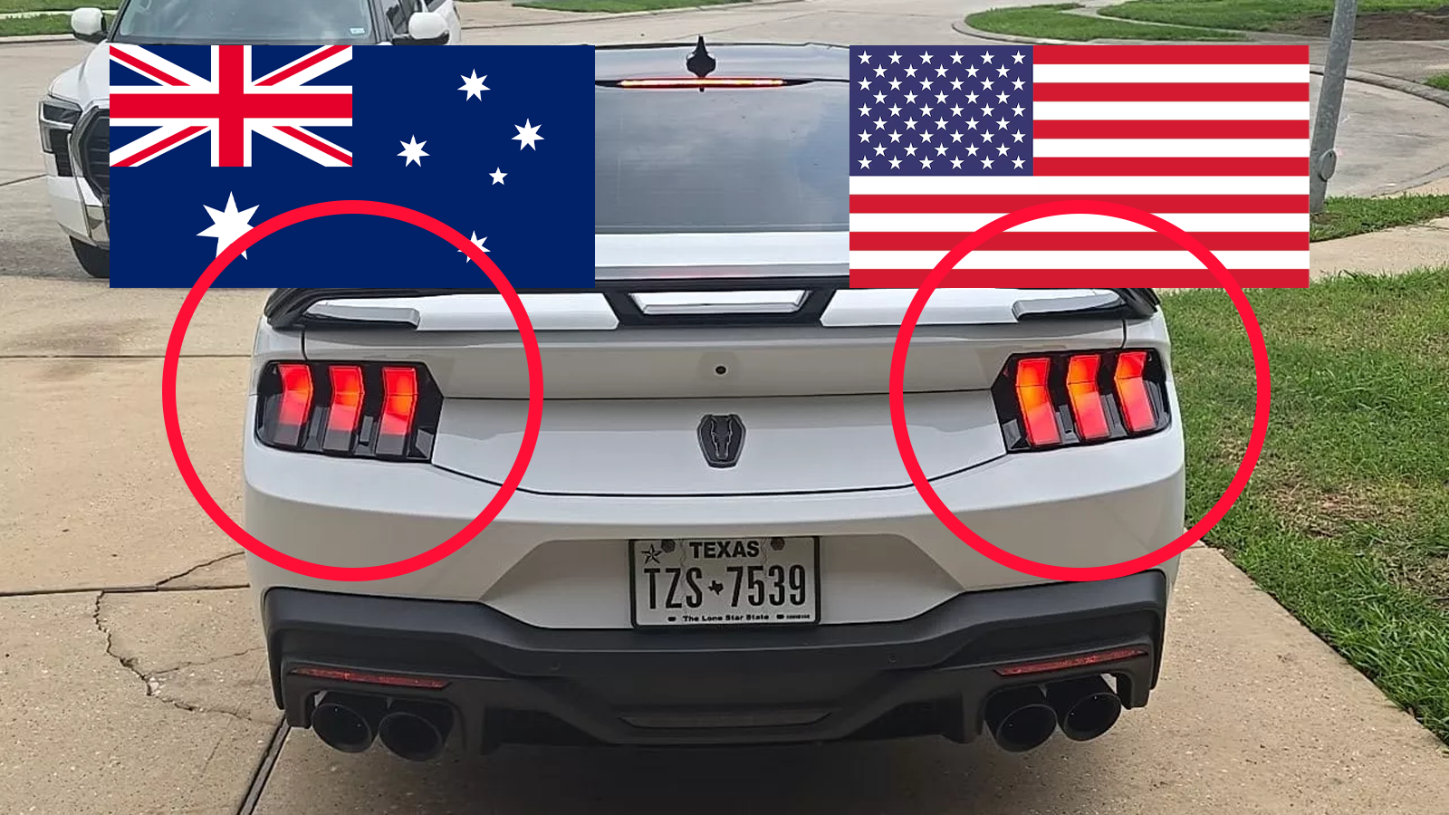 An American Ford Mustang owner discovers his new car has mismatched taillights, highlighting a significant quality control lapse.