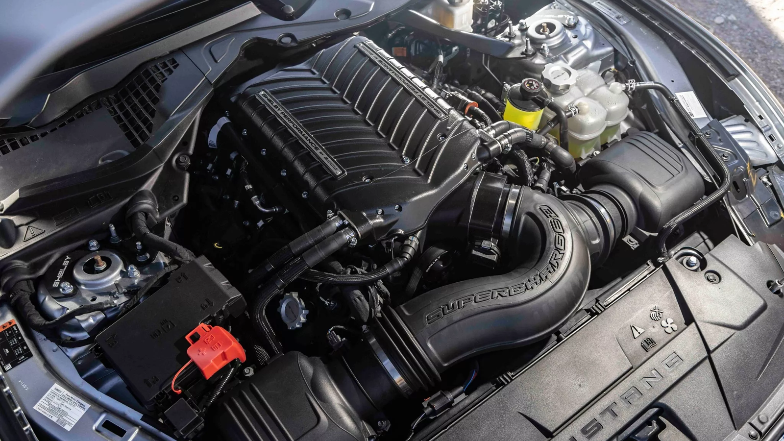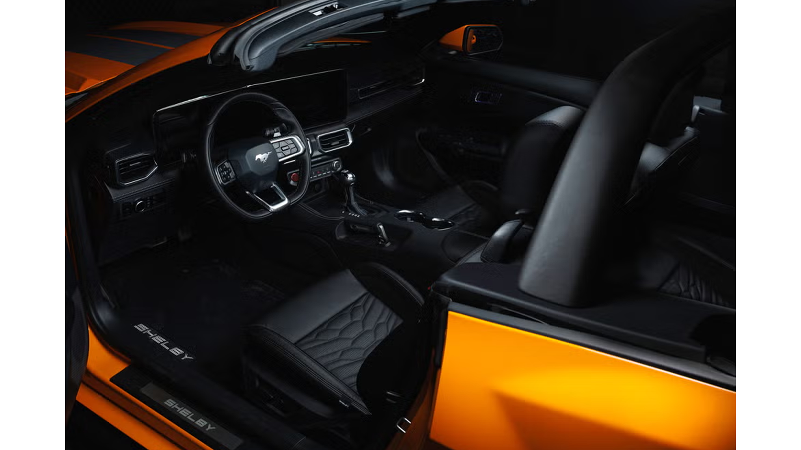Inside, the cabin largely mirrors the standard Mustang layout, but Shelby-specific touches set it apart. The seats are trimmed in leather with quilted inserts, and the dashboard features a serialized Shelby plaque. Manual cars receive a unique shift knob, while embroidered floor mats and available racing stripes reinforce the car’s limited-production status. Convertible models can also be fitted with a roll bar positioned behind the front seats.