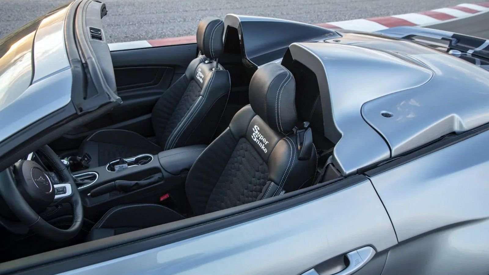 The Shelby Super Snake Speedster is perhaps the most mouth-watering Shelby ever. The rear seats are removed and a beautifully styled convertible tonneau cover braces the driver and passenger seats. Like the coupe, the Speedster features a wide-body design, as well as a Penske track suspension.