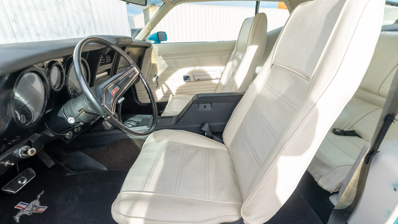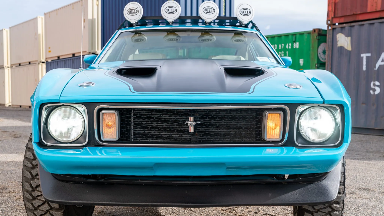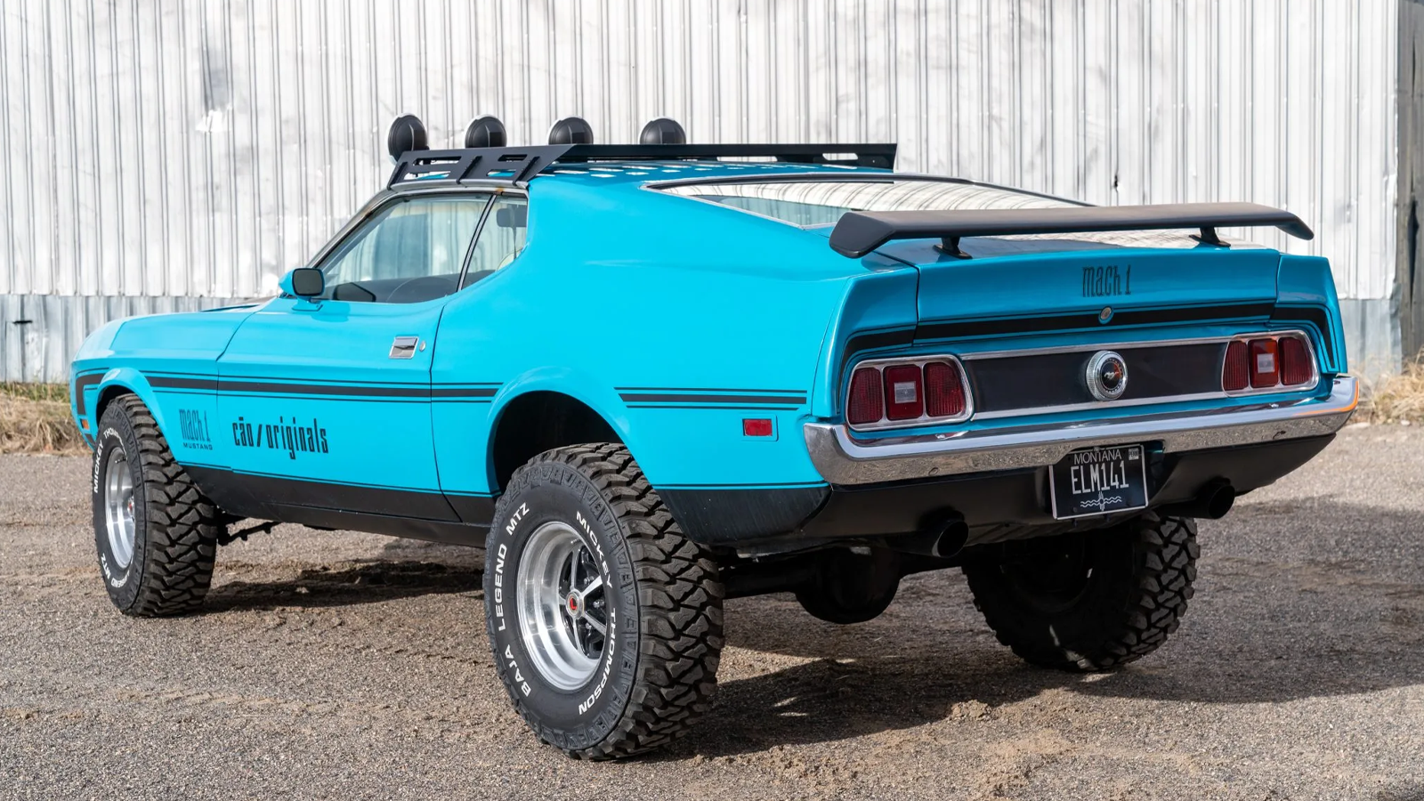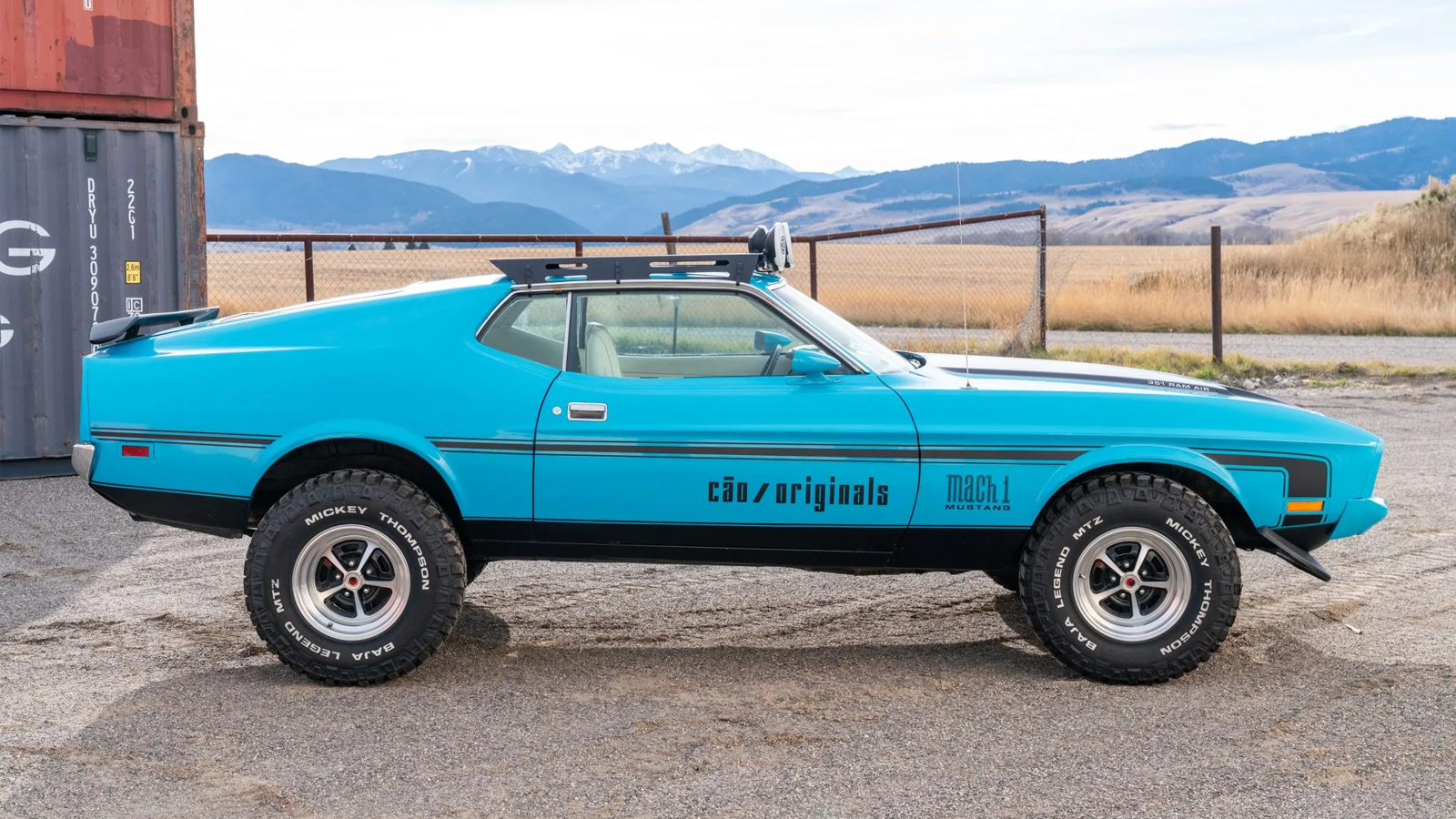 To complete the transformation, the builder equipped the car with 31-inch Mickey Thompson tires, auxiliary lighting, and a safari-style roof rack. Mach 1–inspired paint, striping, hood, grille, and spoilers pull the look together without turning it into a full replica. The result is a Mustang that looks ready for desert trails rather than a concours lawn.