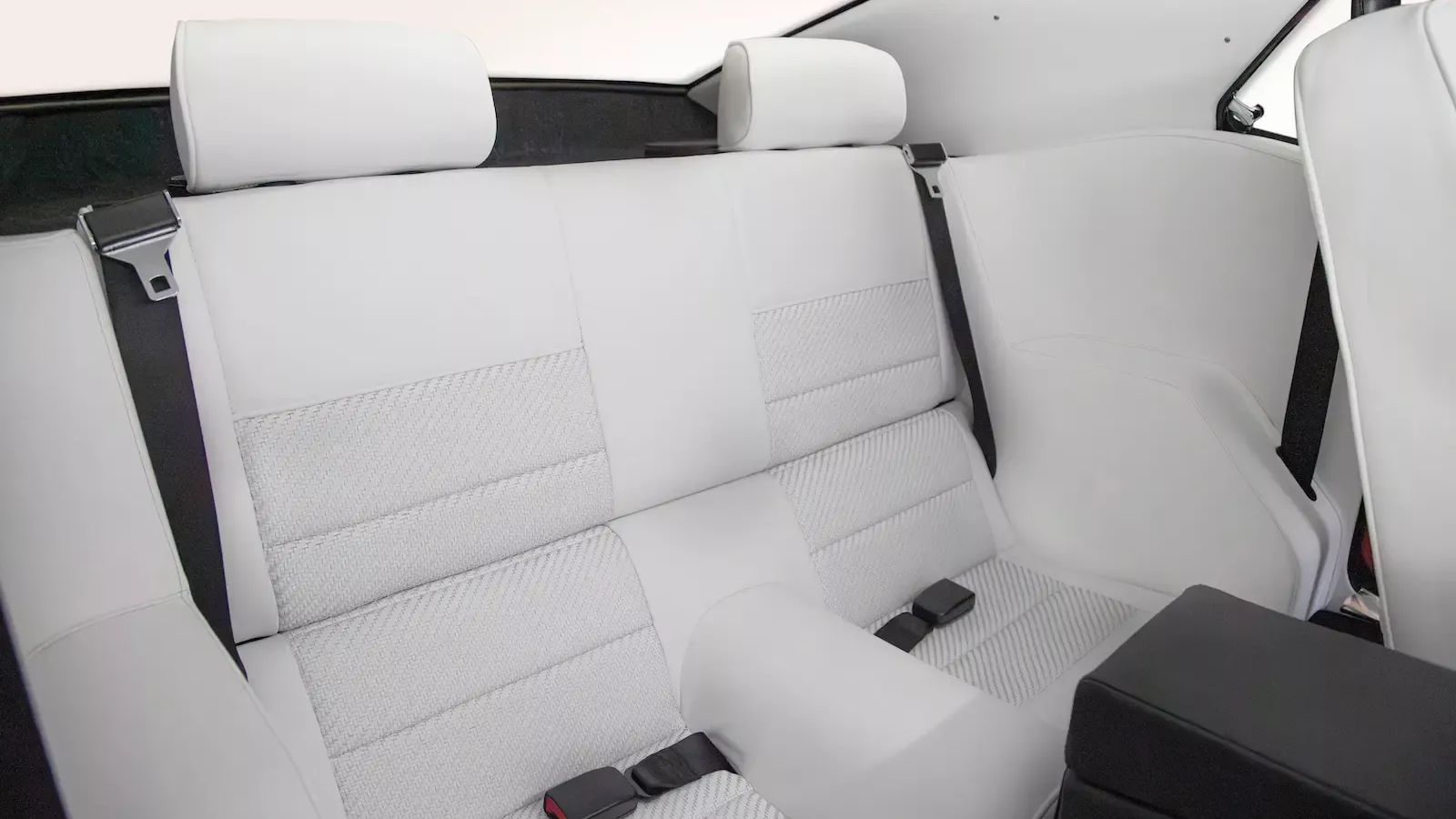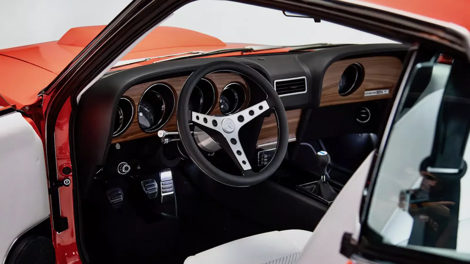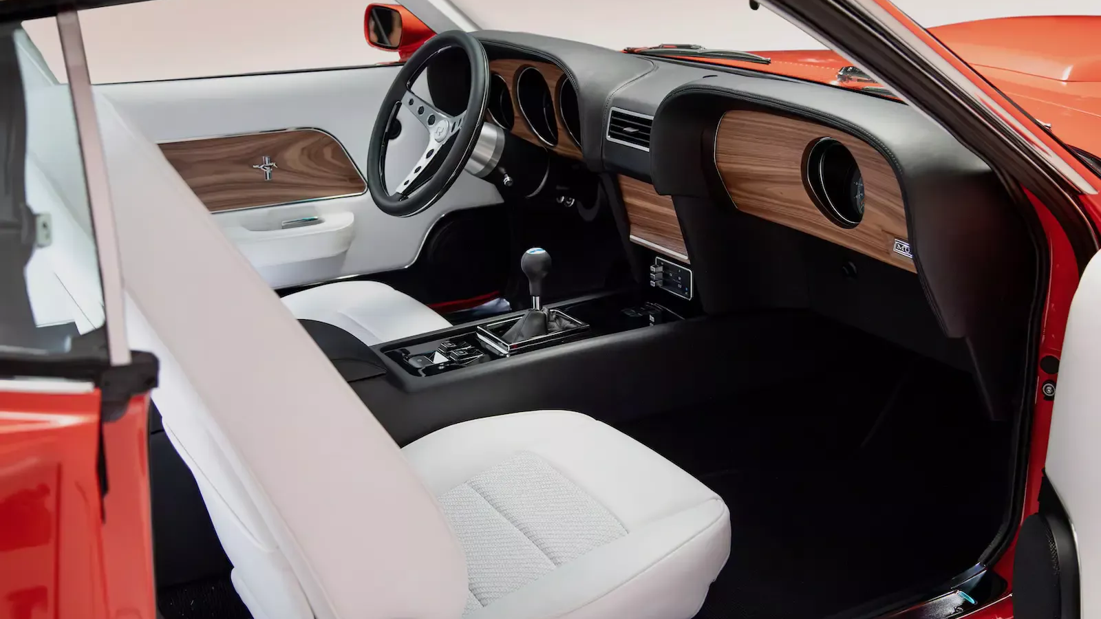 Inside, the reimagined Boss 429 keeps the general visual theme of a late-’60s Mustang but rebuilds it with premium materials and subtle technology. White leather covers the seats and door panels, contrasted with black leather across the dashboard and center tunnel. Wood trim echoes period woodgrain designs, and a custom gauge cluster conceals a seven-inch digital screen. Features like a leather-wrapped steering wheel, reworked ergonomics, and a Harman-Kardon audio system give the interior the atmosphere of a classic cabin without its discomforts.