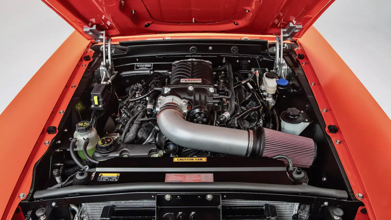 Revology elected not to adapt the original 429-cubic-inch big-block associated with the historic Boss 429. Instead, power comes from a supercharged 5.0-liter Coyote V8, the same architecture used in modern Ford performance cars, rated at 710 horsepower. The engine pairs with either a six-speed manual or a 10-speed automatic transmission, both sending power to the rear wheels. The output more than doubles the 375-horsepower rating of the factory 1969 model.