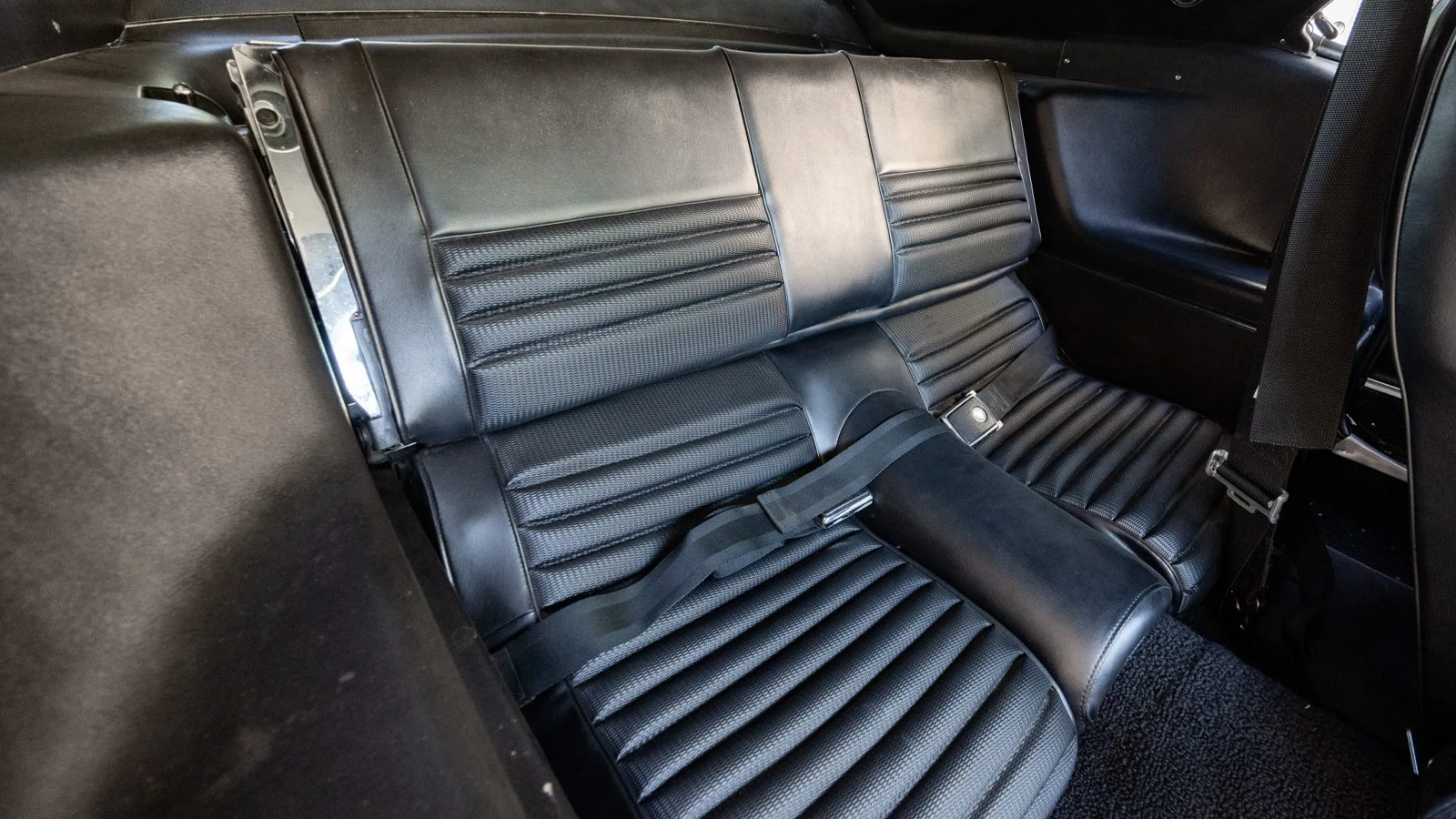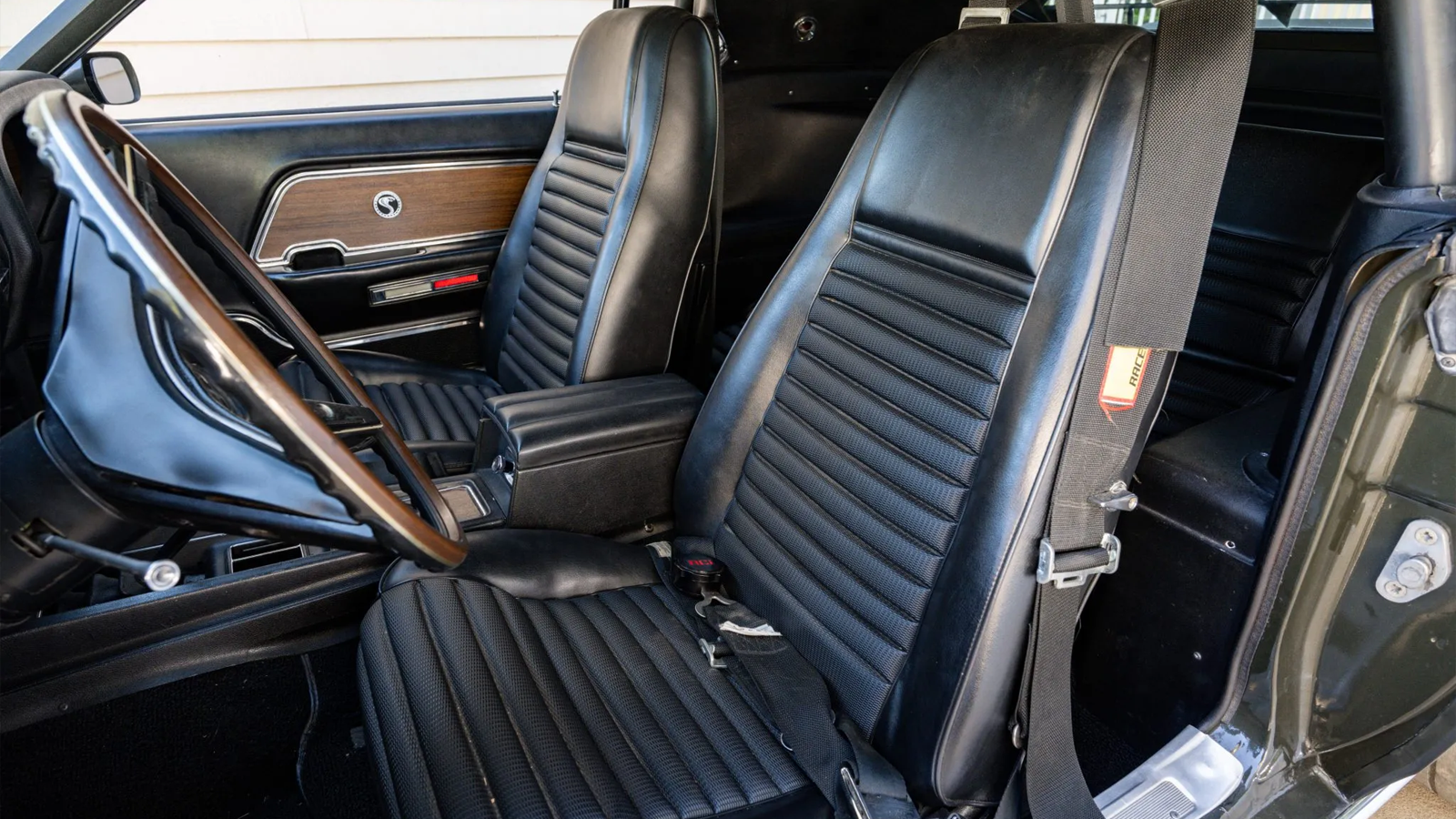 Visually, the Boss retains its 1969 identity. Painted in Black Jade, it carries the correct Boss 429 badging, functional hood scoop, and rear window louvers. The car rides on 15-inch Magnum 500-style wheels, shod with Cooper tires up front and drag radials in the rear. Though heavily reworked mechanically, its period appearance remains intact.