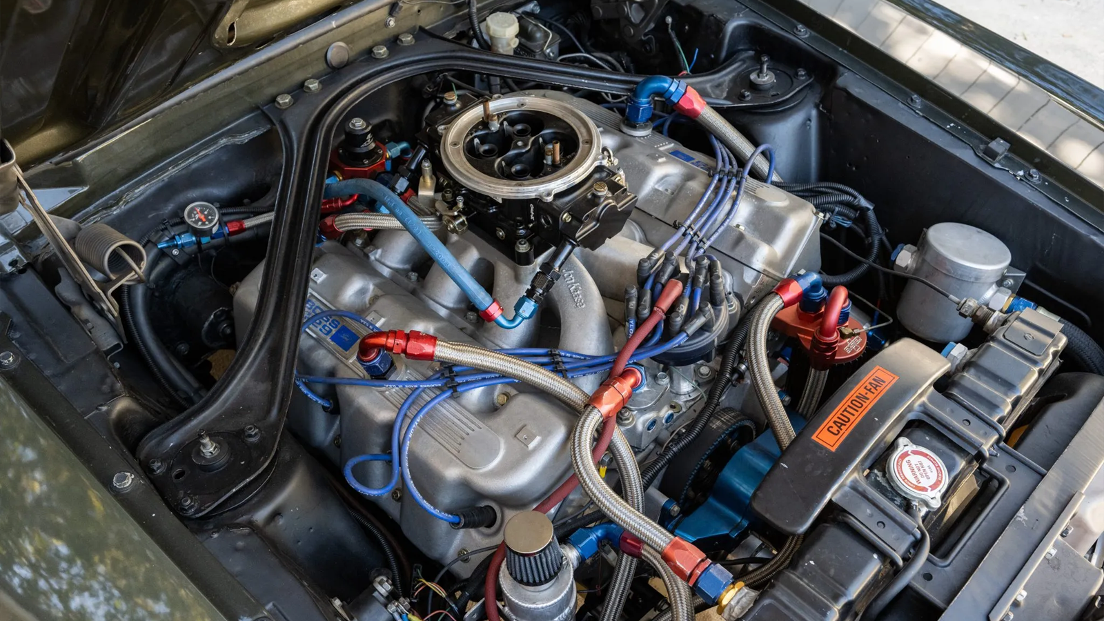 While originally equipped with Ford’s 429 semi-hemi, this car underwent a dramatic transformation in 2018. The factory motor was replaced with a Jon Kaase Racing Engines 598ci V8, built around a Ford Motorsport block. The naturally aspirated unit features a 15:1 compression ratio, a Get’M Garage 1,650-cfm carburetor, Hedman headers, and MSD 7AL ignition. On the dyno, it produced a staggering 1,062 horsepower and 817 lb-ft of torque, nearly triple the output of the factory-rated 375 hp.