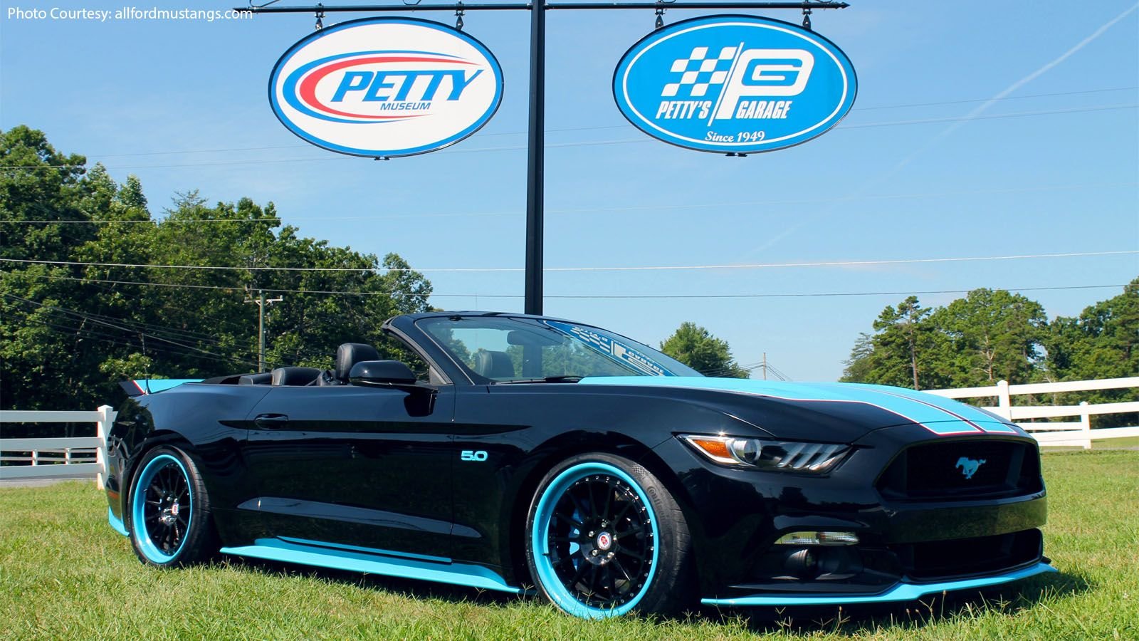 Built in Petty's Garage, Richard customized a very special Ford Mustang. The Mustang featured the blue color combo that he is notoriously famous, which was featured on his original car he used in his first NASCAR race; an exclusive Petty's Garage spoiler and four HRE VMC forge aluminum wheels with calipers that match the exterior. The visually-unique exterior is not the only thing special about this Mustang, it also features a Roush TVS 2300 Supercharger, a Big Brake Kit Wilwood brakes, and special coil-overs designed by Petty's Garage for both the front and the rear.