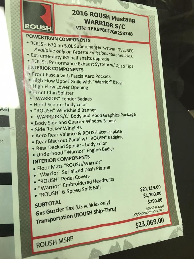 Visually, the package comes with a front splitter, a new front fascia, a rear spoiler and valance, scoops (that apparently aren’t real?), and black aluminum wheels with red lips. And there’s a whole mess of ROUSH and Warrior badging throughout (check the full list in the images).