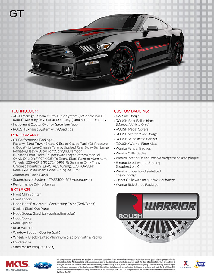 If you are overseas U.S. Military, first of all, thank you for your service. Secondly, you can buy the trim with either the EcoBoost mode or the GT. The biggest addition is the ROUSH Supercharger system that boosts horsepower to 627. You also get “unique chassis tuning,” a bigger radiator, strut-tower and K-braces, performance front springs, Brembo brakes, and a TORSEN rear axle.