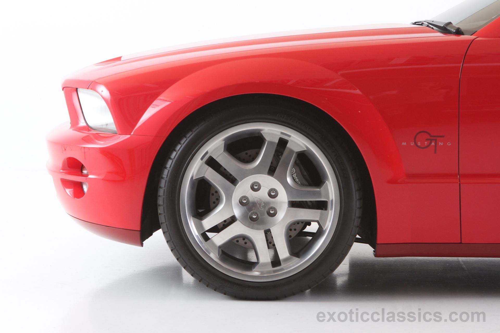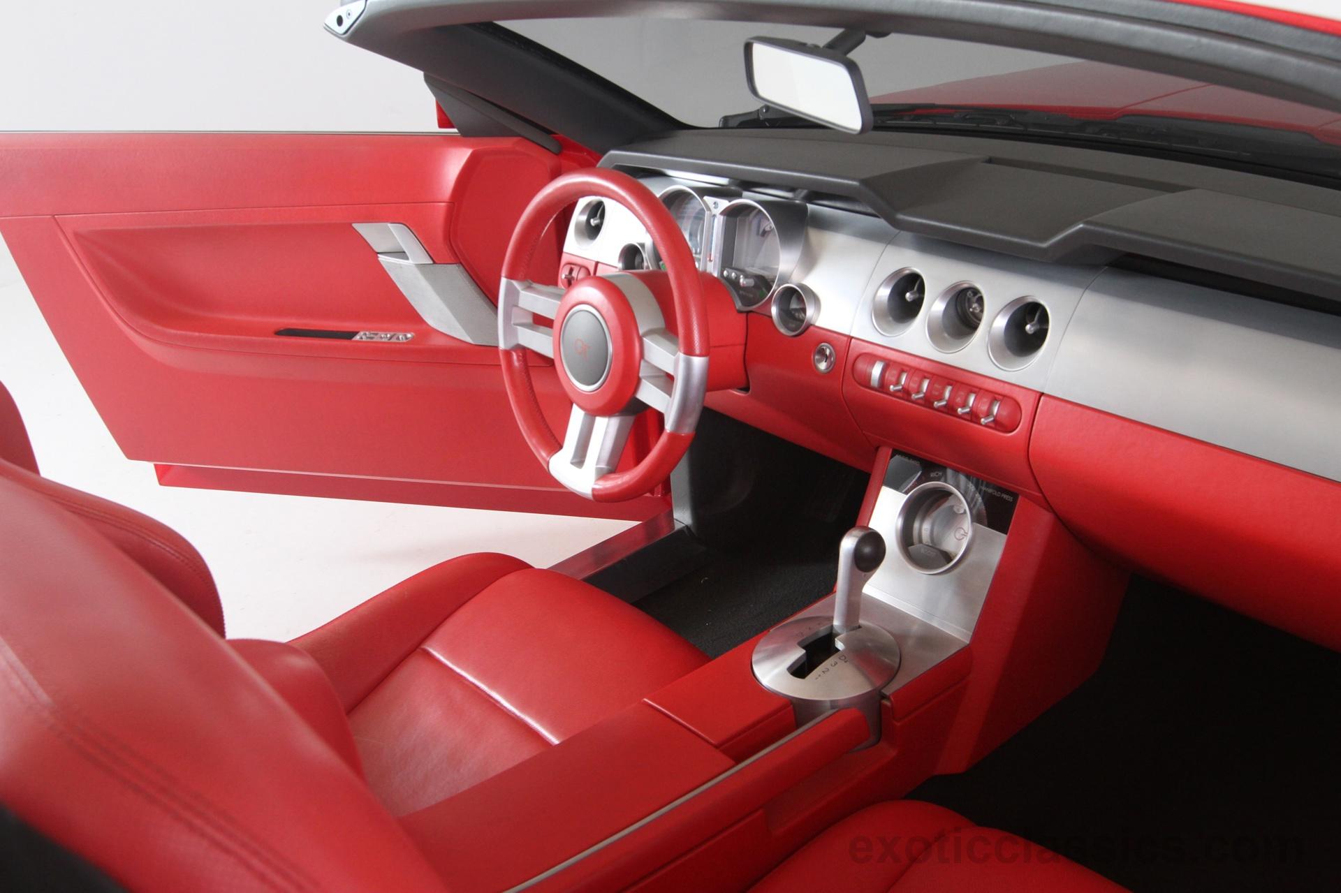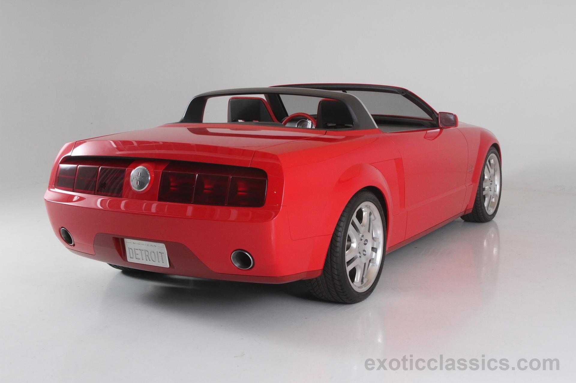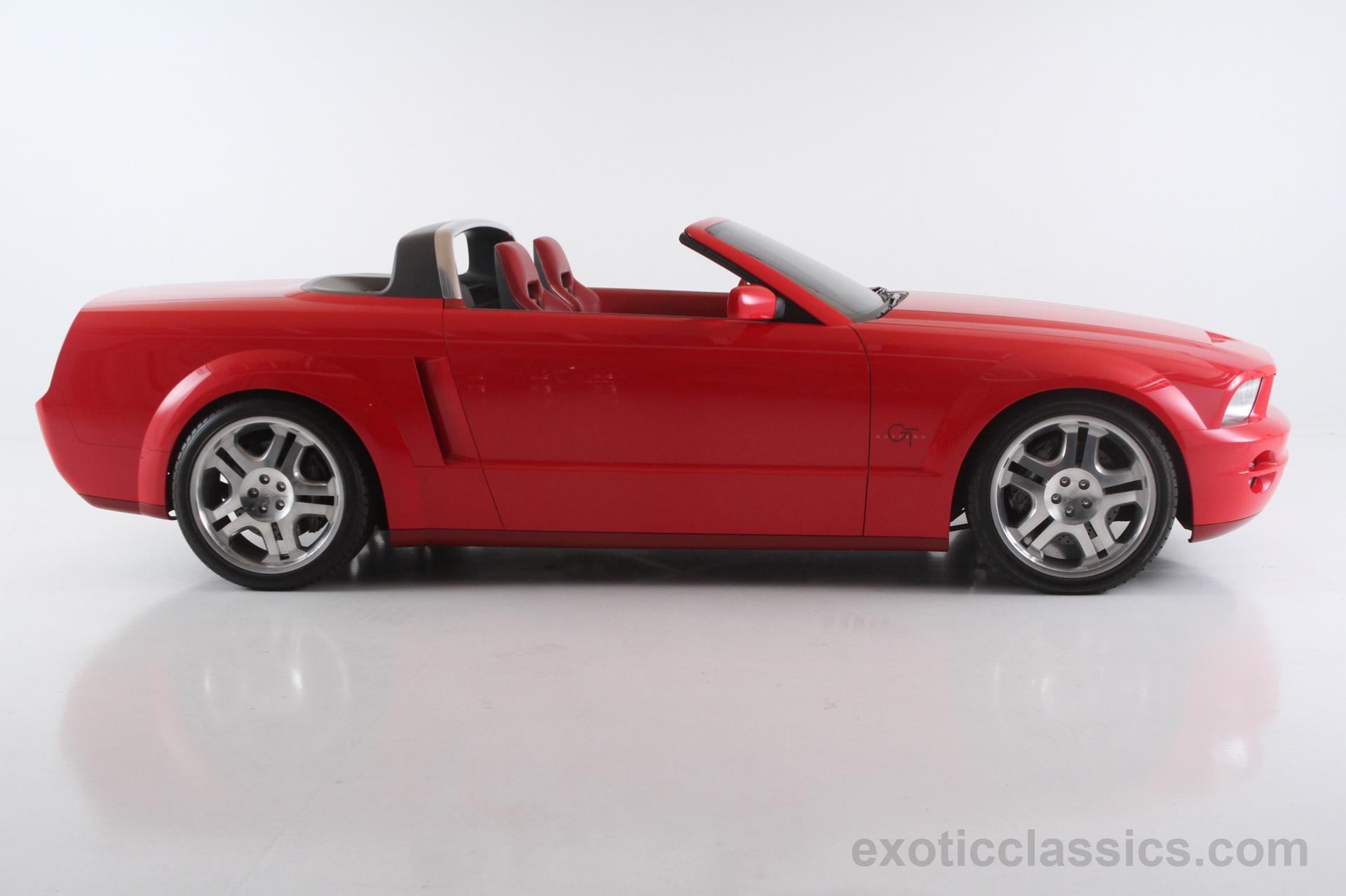 The Mustang GT convertible concept, which debuted at the 2003 North American Auto Show in January, features a Redline Red Metallic exterior paint and a distinct “showbar” with a rim of billet-aluminum trim where the instrument panel and console trim leave off, as noted on Exotic Classics website.
