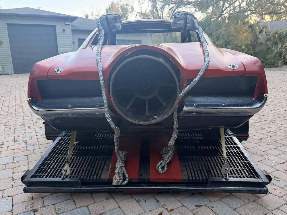 Out back, one can’t help but notice this car’s centerpiece – a Westinghouse J34 turbine that reportedly came from a McDonnell F2H Banshee once enlisted in the U.S. Navy itself. It’s surrounded by custom fiberglass bodywork, flanked by a pair of drag chutes to slow it down, and held up by a custom suspension setup and rear end. The 1967 Mustang rolls on a set of slotted aluminum wheels wrapped with Goodyear tires, which are probably in need of replacement given their age.